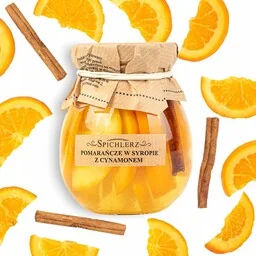 Pomarańcze w syropie z cynamonem 260 g Plastry pomarańczy zatopione w gęstym, aromatycznym syropie z dodatkiem pachnącego cynamonu to rozgrzewające połączenie cytrusowej świeżości i korzennej głębi. Delikatna słodycz, soczysty miąższ i charakterystyczna nuta przyprawy sprawiają, że produkt idealnie komponuje się z herbatą, grzanym winem czy domowymi wypiekami. To klasyczny zimowy smak pełen aromatu, ciepła i naturalnego charakteru. Dlaczego warto wybrać pomarańcze w syropie z cynamonem? Pomarańcze są źródłem witaminy C, która wspomaga odporność, poprawia kondycję skóry i pomaga w walce z wolnymi rodnikami. Ich naturalna soczystość i kwaskowatość świetnie kontrastują ze słodkim syropem.