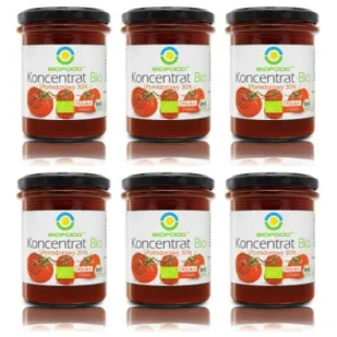 Koncentrat pomidorowy 30 % zestaw 6 x 200 g Nasz ekologiczny koncentrat pomidorowy 30% powstał z 1 kilograma aromatycznych, dojrzewających w słońcu świeżych ekologicznych pomidorów, bez dodatków. To wspaniała, gęsta baza do przygotowania przepysznej zupy pomidorowej, sosów do mięs lub ryb a także gołąbków, spaghetti czy dipów. Produkt wegański, bez laktozy, mleka i drożdży, bezglutenowy. Produkt pasteryzowany, wyprodukowany z 1 kg świeżych ekologicznych pomidorów. Zawartość ekstraktu 30% +/- 2%.