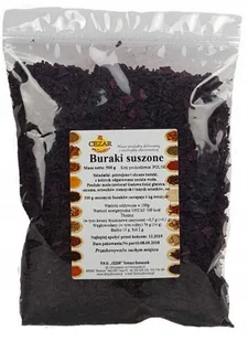 BURAKI SUSZONE 500g Opis produktu: Buraki suszone to obrane i pokrojone warzywa, z których odparowana została jedynie woda. Całkowicie zastępują świeże. 100 ...