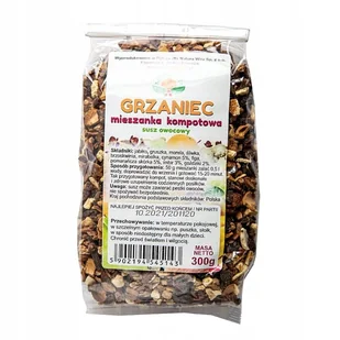 Grzaniec mieszanka kompotowa. Susz owocowy, 300g, Natura Wita Składniki: jabłko, gruszka, morela, śliwka, brzoskwinia, mirabelka, cynamon 5%, figa, pomarańcz...