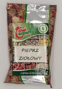 · Pieprz ziołowy · Skład: kolendra, kminek, majeranek, gorczyca, liść laurowy, papryka chilli, pieprz czarny, pieprz zielony · Masa netto: 100 g