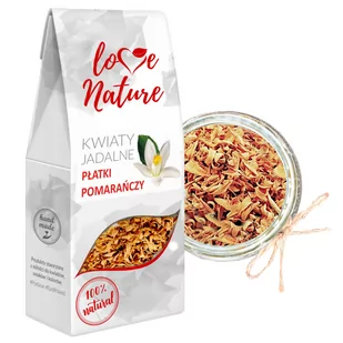 Love Nature - Płatki Pomarańczy Skład: kwiat jaśminu 100% Piękne, pachnące i naturalne płatki kwiatu pomarańczy. Produkt ten odpowiednio przygotowany, pozwoli Państwu na wspólne eksperymentowanie z nim bez żadnych ograniczeń. Płatki mają nie tylko zniewalający zapach, ale też wspaniałe wartości kulinarne oraz prozdrowotne. Możliwości są nieograniczone – wypróbuj tę naturalną, barwną dekorację przygotowując ciasta, tort, kanapki, sałatki, czy smoothie.