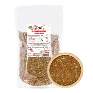 Pomidor z bazylia i czosnkiem 200g PRODUKT NATURALNY, WYSOKIEJ JAKOŚCI Produkt pakowany jest w opakowanie typu "doypack" ze struną co pozwala na zachowanie długiej świeżości, gdyż można takie opakowanie wielokrotnie otwierać i zamykać a samo opakowanie jest trwałe co jest istotne podczas transportu. Pomidory z czosnkiem i bazylią nadają się idealnie do wszystkich dań kuchni włoskiej oraz śródziemnomorskiej, a zwłaszcza do past, zapiekanek, sałatek, mięsa i sosów. Dania z pomidorami, bazylią i czosnkiem oprócz walorów smakowych zyskają również barwny i apetyczny wygląd. Zawartość: Opakowanie zawiera 200g przyprawy pomidor z bazylią i czosnkiem. Skład: pomidor suszony bazylia czosnek papryka sól Sposób przechowywania: