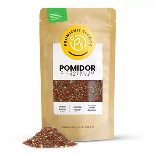 Przyprawa POMIDOR Z CZOSNKIEM I BAZYLIĄ 100 g Składniki Pomidor 50%, czosnek 30%, bazylia 20% Warunki przechowywania Przechowywać w suchym i chłodnym miejscu, chronić przed działaniem promieni słonecznych. Alergeny Produkt może zawierać: orzechy ziemne, inne orzechy, sezam, gluten, seler, dwutlenek siarki, gorczyca.