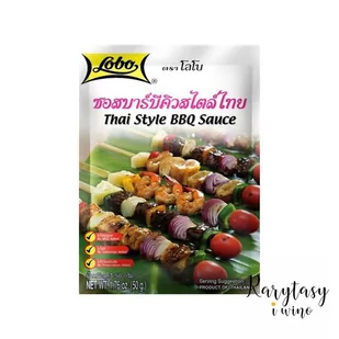 Tajska Pasta do Sosu Barbecue [Idealna na Grilla] "Thai Style BBQ Sauce" 50g Lobo Waga netto: 50g Skład: sos ostrygowy (soja, pszenica, ostrygi, sól), cukier z palmy kokosowej, sos sojowy (soja, sól), przyprawy (czosnek, pieprz, korzeń kolendry), sos rybny (ekstrakt z anchois, sól, cukier), woda, olej sojowy, skrobia ziemniaczana. Może zawierać śladowe ilości skorupiaków. Wartość odżywcza / 100g: wartość energetyczna 692kJ/164kcal, tłuszcz 4,1g (w tym kwasy nasycone 0,6g), węglowodany 28g (w tym cukry 22g), białko 3,8g, sól 5g.