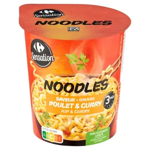 Danie instant z makaronem (88,7 %) i mieszanką przyprawową o smaku przyprawy curry i kurczaka (11,3 %).