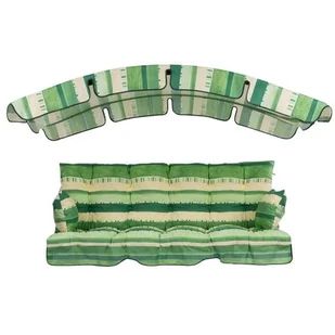 Dodatkowe troczki mocujące umożliwiają stabilne przymocowanie poduszek do konstrukcji huśtawki, zapobiegając ich przesuwaniu się. Całość utrzymana w odcieniach zieleni i beżu tworzy świeży, naturalny wygląd, który doskonale komponuje się z ogrodową roślinnością.