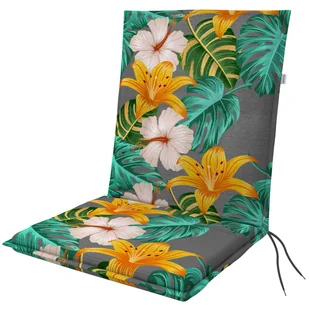 Poduszka na krzesło LIVING 5701 kwiaty wypełniona pianką poliestrową, pokrycie z poliestru 118 g/m2. Zapięcie na przesuwany klips umożliwia łatwe dopasowanie poduszki do rodzaju krzesła, a wiązania w zagięciu poduszki zapewniają stabilne mocowanie do siedziska. Wymiary: Wymiary poduszki: 100 x 48 x 6 cm Wymiary siedziska: ok. 46 x 48 cm Wymiary oparcia: