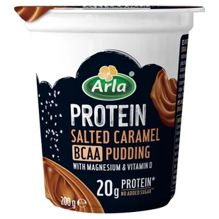 Deser wysokobiałkowy o smaku słonego karmelu, bez laktozy, z dodatkiem witaminy D i magnezu. Zawiera substancje słodzące i aminokwasy (BCAA). UHT.
