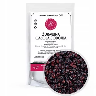 Żurawina suszona cała Suszona żurawina jest wytwarzana przez częściowe odwodnienie świeżej żurawiny. Są popularne w mieszankach szlakowych, sałatkach, pieczywie, ze zbożami lub spożywane na własną rękę. Parametry: Kraj pochodzenie: USA / KANADA Składniki: żurawina 68-75%, cukier trzcinowy 25-35%, olej słonecznikowy 1-3% Opakowanie: