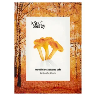 Leśne SkarbyKurki blanszowane całe / Cantharellus Cibarius. Produkt głęboko mrożony. Opakowanie: foliowe300 g300 gWyprodukowano w Polsce. Kraj pochodzenia głównego składnika podany w/g kodów ISO 3166 - nadruk przy dacie przydatności.