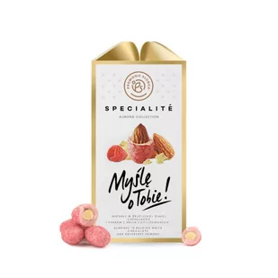Mini Box: Myślę o Tobie! Migdały w czekoladzie 80 g Idealny balans smaków: połączenie chrupiących migdałów z malinami liofilizowanymi i rozpływającej się w ustach białej czekolady. Orzechowe nuty i słodko-mleczna czekolada to klasyczna kompozycja w najlepszym wydaniu. W naszej mieszance doskonały smak gwarantuje jakość produktów: świeżych i chrupiących orzechów oraz belgijskiej czekolady, powszechnie uznawane za najsmaczniejszą na świecie.