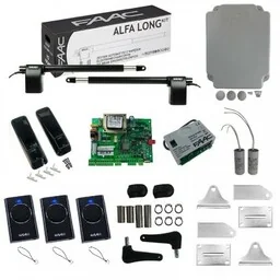 - Zestaw dwóch siłowników FAAC ALFA LONG 414 230V - Centrala sterująca E045S - Obudowa do centrali sterującej - model E - Moduł radiowy XF 868 - 3 x Pilot 4-kanałowy XT4 868 SLH LR czarny - Komplet fotokomórek XP 20B D (nadajnik + odbiornik) - 2 x Kondensator rozruchowy - 2 x Klucz odblokowujący - Akcesoria montażowe - Instrukcja instalacji, użytkowania i konserwacji - Karta gwarancyjna (24 miesiące)