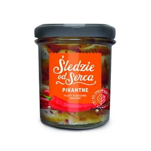 Opis szczegółowy Śledzie od serca pikantne filety śledziowe krojone 300g Parametry produktuSkładniki: Marynowane filety ze śledzia 45%, olej rzepakowy 25,7%, cebula marynowana, marchew gotowana, seler gotowany, przyprawy, koncentrat papryki. Gatunek ryby: Śledź Filetowanie: Filety Skóra: