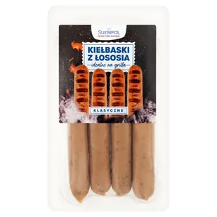 Suempol idealne na grilla Kielbaski z Łososia, klasyczne. Kiełbasa łososiowa, rozdrobniona, wędzona, parzona.