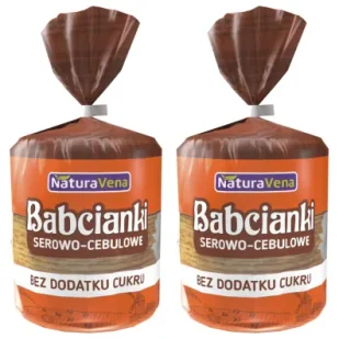 Babcianki serowo-cebulowe bez dodatku cukru Zestaw 2 x 110 g Babcianki to cieniutkie wafelki z pieca wypiekane na suchej płycie bez stosowania zbędnego tłuszczu. Okrągłe, chrupiące ciasteczka stanowią idealną przekąskę. Nie zawierają cukru, barwników i spulchniaczy.