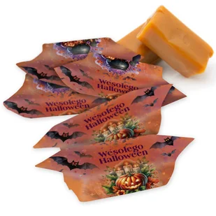 Materiał: produkt zawiera mleko (łącznie z laktozą), może zawierać zboża zawierające gluten (pszenica, żyto), nasiona sezamu, soję, dwutlenek siarki, orzeszki arachidowe i inne orzechy. Nadruk: tematyczne papierki z motywem halloweenowym i napisem „Wesołego Halloween”. Zastosowanie: słodka przekąska na imprezę halloweenową, prezent dla gości, dodatek do zabawy „trick or treat”. Wielkość: krówka: ok. 3 × 1,5 × 1,5 cm krówka w papierku: