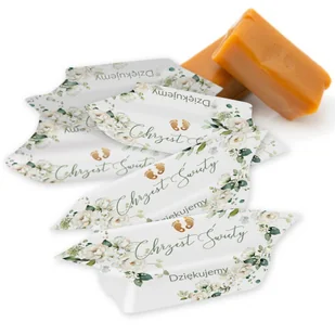 dziecięce stópki i napisy nawiązujące do Chrztu Świętego Papierki matowe, gotowe do wręczenia Idealne do bezpośredniego podania lub umieszczenia w pudełeczkach, woreczkach z organzy czy na stole jako dekoracja Wymiary: Krówka bez papierka: ok. 3 × 1,5 × 1,5 cm Krówka w papierku: ok. 6,5 × 1,5 × 1,5 cm Waga jednej krówki: ok. 12,5 g Informacje o alergenach: