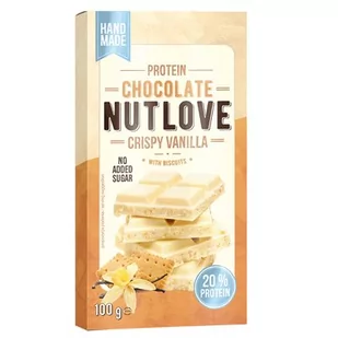 OPAKOWANIE: 100 G, BIAŁKO: 20 G, CUKRY: 11 G Dlaczego PROTEIN CHOCOLATE NUTLOVE CRISPY VANILLA WITH BISCUITS? PYSZNA BIAŁA CZEKOLADA O SMAKU WANILIOWYM Z HERBATNIKAMI BEZ DODATKU CUKRU ŚWIETNA ALTERNATYWA DLA TRADYCYJNEJ CZEKOLADY Z DODATKIEM ODŻYWKI BIAŁKOWEJ (WPC) IDEALNA DLA KAŻDEGO ALLNUTRITION PROTEIN CHOCOLATE CRISPY VANILLA WITH BISCUITS to czekolada z dodatkiem herbatników, która stanowi, połączenie oszałamiającej delikatnej słodyczy z chrupkim, ale jak że istotnym elementem w postaci herbatnika, tworzącym perfekcyjną kompozycję. Wszystkie czekolady marki ALLNUTRITION tworzymy są na podstawie opinii konsumentów.