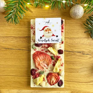 Biała czekolada z owocami i orzechami na Mikołajki i Boże Narodzenie Pyszna biała czekolada z nutą wanilii, owocami liofilizowanymi i mieszanką orzechów z piękną świąteczną etykietą najlepszej jakości czekolada produkt wykonany ręcznie połączenie estetyki i smaku doskonały pomysł na upominek z okazji Świąt Bożego Narodzenia Subtelna, delikatna, aksamitna w smaku, ręcznie wykonana tabliczka białej czekolady z uroczą świąteczną etykietą. Rzemieślnicza praca pełna pasji, najlepszej jakości aromatyczne składniki oraz połączenie estetyki i wyjątkowego smaku, z myślą o zbliżających się Świętach Bożego Narodzenia. Idealny balans słodyczy, delikatna nuta wanilii, wyrafinowana kombinacja liofilizowanych owoców oraz prażonych orzechów dla każdego miłośnika czekoladowych pyszności. Podaruj słodkie wspomnienia w wyjątkowej, świątecznej odsłonie. . . Wszystkie nasze produkty od początku do końca wyrabiane i dekorowane są ręcznie, dlatego mogą nieznacznie różnić się od siebie wyglądem czy masą netto.
