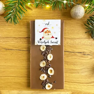 Czekolada karmelowa z ziarnem kakaowca - Boże Narodzenie Pyszna czekolada karmelowa z dodatkiem orzechów laskowych i chrupiących ziaren kakaowca z okazji Mikołajek i Świąt Bożego Narodzenia najlepszej jakości czekolada chrupiące dodatki produkt wykonany i dekorowany ręcznie idealny upominek z wyjątkową świąteczną etykietą Wyjątkowa tafla ze świąteczną etykietą. Połączenie ręcznie wykonanej, najlepszej jakości białej czekolady ze złotobrązowym karmelem. Intensywna barwa oraz nieziemska słodycz, przełamana chrupiącymi orzechami laskowymi oraz gorzkawymi, bogatymi w smaku prażonymi ziarnami kakaowca w postaci nibsów. Kremowa, aksamitna konsystencja, słodki smak z nutami karmelu, intensywne, chrupiące ziarenka kakaowca - pyszna, harmonijna kombinacja stworzona z myślą o Mikołajkach oraz Świętach Bożego Narodzenia. Idealny balans smaków i aromatów.