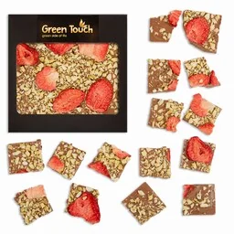 Doskonała czekolada z manufaktury z dodatkiem truskawki i kiwi liofilizowanych Green Touch we współpracy z zaufaną manufakturą słodyczy tworzy wyjątkowe czekolady, których smak i aromat na długo pozostanie w pamięci każdego miłośnika słodyczy. To właśnie dobór naturalnych i jakościowych składników oraz prawdziwych aromatów waniliowych, sprawia że smak czekolady jest tak wyjątkowy. Składniki: czekolada mleczna (cukier, tłuszcz kakaowy, mleko pełne w proszku, miazga kakaowa, emulgator: lecytyna sojowa, ekstrakt waniliowy), owoce liofilizowane 8% w zmiennych proporcjach (truskawka, kiwi). Masa kakaowo min. 35% Informacja dla alergików: