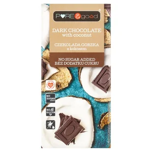 Czekolada gorzka z kokosem bez dodatku cukru 75 g Pure&Good - źródło magnezu- wysoka zawartość białka i błonnika- odpowiednia dla diabetyków- z dodatkiem kokosa Gorzka czekolada z kokosem bez cukru to świetna alternatywa dla tradycyjnej czekolady. Jest słodzona maltitolem, czyli substancją produkowaną z maltozy, która naturalnie występuje w ziarnach zbóż i w kukurydzy. Gorzka czekolada zawiera magnez, który wspiera wiele ważnych funkcji w organizmie człowieka. Magnez pomaga w stabilizacji pracy układu nerwowego, sprawne funkcjonowanie układu sercowo-naczyniowego, wspiera proces koncentracji i zapamiętywania. SKŁADNIKIsubstancja słodząca (maltitol), miazga kakaowa (miejsce pochodzenia: spoza UE), tłuszcz kakaowy, rozdrobniony orzech kokosowy (8%), inulina, odtłuszczone kakao w proszku, emulgator (lecytyna słonecznikowa), aromaty (kokosowy i naturalny waniliowy).