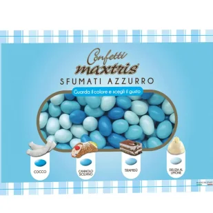 1Kg Maxtris Ciocomandorla Sfumati Azzurro to premium włoskie dragées marki Maxtris w pięknych odcieniach niebieskiego gradientu 💙. Zawierają prażone migdały (18%) otulone białą czekoladą (60%) o smakach kokosa, sycylijskiego cannoli, tiramisu i cytrynowego delizia. Te konfetti bez oleju palmowego są idealne na uroczystości dla chłopca, chrzciny lub eleganckie wydarzenia w niebieskiej tonacji. Opakowanie 1kg włoskich wyrobów cukierniczych.