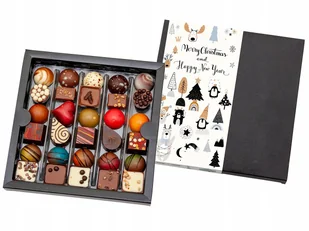 Bombonierka na prezent, Boże Narodzenie, Mikołajki… 250 g Podaruj wyjątkowy prezent na Święta Bożego Narodzenia bliskiej osobie, wybierając bombonierkę z mieszanką wyśmienitych pralinek o różnych kształtach, dekoracjach i smakach – od delikatnych orzechowych akcentów po intensywne nadzienia z alkoholem. • czekoladki ułożone na przezroczystej tacy i przykryte czarną kołderką • zapakowane w stylowe opakowanie z czarnego, matowego kartonu • na opakowanie nałożona papierowa obwoluta – trzy wzory graficzne do wyboru (wzór 1, wzór 2, wzór 3) • wewnątrz opakowania znajduje się ulotka ze składem oraz terminem przydatności Specyfikacja produktu: • waga netto: 250 g • wymiary opakowania: 178 × 177 × 24 mm • okres przydatności: