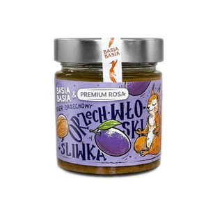 Basia Basia Premium Rosa Krem z orzechów włoskich z nerkowcami, daktylami w proszku i suszoną śliwką 195 g. żywność. Orzech włoski z charakterem i słodycz dojrzałej, suszonej śliwki - duet jak domowa kuchnia babci, tyle że w słoiku i bez dodatku cukru!