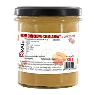 Krem orzechowo czekoladowy z cuksami 330gPRODUKT NATURALNY, WYSOKIEJ JAKOŚCIKrem orzechowo-czekoladowy z chrupiącymi dodatkami to prawdziwa gratka dla miłośników słodkości i orzechowych smaków. Gęsta, kremowa konsystencja idealnie rozsmarowuje się na pieczywie, a dodatki w postaci karmelizowanych ziaren słonecznika w polewie czekoladowej zapewniają przyjemną, chrupiącą teksturę, którą trudno się oprzeć. To doskonały wybór na słodką przekąskę, która łączy smak prażonych orzechów ziemnych i delikatnej białej czekolady. Krem orzechowo-czekoladowy z cuksami – właściwości: Ten krem to nie tylko uczta dla podniebienia, ale też wartościowy składnik diety, ponieważ orzechy ziemne, stanowiące aż 54% składu, są źródłem białka i zdrowych tłuszczów nienasyconych, które wspierają zdrowie serca i dodają energii.