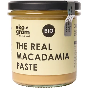 THE REAL MACADAMIA PASTE – BIO Pasta z Orzechów Makadamia 100% THE REAL MACADAMIA PASTE to w 100% naturalna pasta z orzechów makadamia o wyjątkowo kremowej konsystencji i delikatnie słodkim, wyrafinowanym smaku. Produkt powstaje wyłącznie z prażonych, ekologicznych orzechów makadamia, bez dodatku soli, cukru, oleju palmowego ani konserwantów. Naturalny smak i prosty, jeden składnik Pasta z orzechów makadamia Ekogram to produkt o krótkim, przejrzystym składzie: Składniki: 100% BIO orzechy makadamia prażone bez dodatku soli bez dodatku cukru bez oleju palmowego i innych tłuszczów bez konserwantów oraz sztucznych aromatów Taki skład sprawia, że BIO pasta z orzechów makadamia zachowuje naturalny smak orzechów i ich charakterystyczny, maślany profil. Dlaczego warto wybrać pastę makadamia Ekogram? BIO pasta z orzechów makadamia to produkt dla osób, które poszukują: