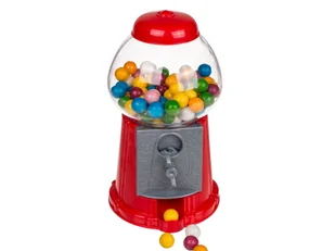 Tak bardzo lubiany przez dzieci, pokaźnych rozmiarów dystrybutor gum. Można w nim trzymać nie tylko gumy, ale tez landrynki i inne cukierki. Aby wydobyć łakocie należy przekręcić pokrętło. Materiał tworzywo sztuczne. Zapakowany w otwarty kartonik.