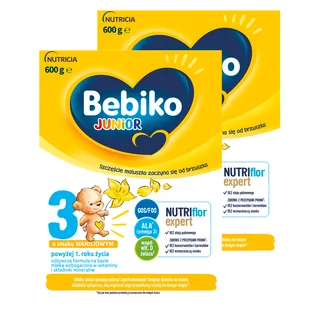Zestaw Bebiko Junior 3 Nutriflor Expert, odżywcza formuła na bazie mleka, powyżej 1 roku, smak waniliowy, 2 x 600 g