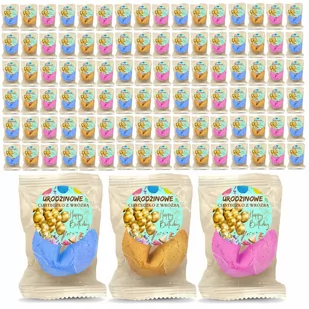 100x CIASTECZKO Z WRÓŻBĄ MAGICZNE URODZINY DLA GOŚCI KOLOROWE + naklejka
