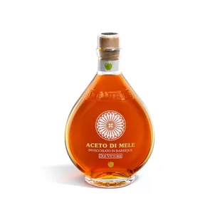 Włoski Ocet Jabłkowy z Jabłek Gatunku Marlene "Aceto di Miele Invecchiato in Barrique" 250ml Due Vittorie Włoski ocet jabłkowy od marki Due Vittorie to wyjątkowe ocet jabłkowy dojrzewający w dębowych beczkach, otrzymywany wyłącznie z użyciem tradycyjnych metod, charakterystycznych dla produkcji octu balsamicznego. Pozyskiwany przez powolną fermentację cydru z jabłek gatunku Marlene w dębowych beczkach. Ocet jabłkowy od Due Vittorie cechuje naturalny bursztynowy, ciemny, przejrzysty kolor, przyjemny, zrównoważony smak i aksamitna, lekko gęsta tekstura. Ocet ma wyrazisty, słodko-kwaśny, ostry smak idealnie zrównoważony słodyczą jabłek, z wyczuwalnymi nutami drewna dębowego, bogaty w taniny, intensywnie owocowy. Aromat mimo wyraźnego octowego charakteru, intensywnie jabłkowy.