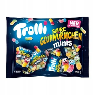 TROLLI żelki kwaśne robaczki 200 g Składniki : Składniki: syrop glukozowy; Cukier; modyfikowana skrobia ziemniaczana; Żelatyna; zakwaszacze: kwas cytrynowy, ...