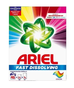 ARIEL Proszek do prania kolorów 46 prań 2,53 kgAriel Fast Dissolving. Proszek do Prania to doskonałe rozwiązanie, które zapewni Ci skuteczne i efektywne pranie. Ten wysokiej jakości proszek został stworzony specjalnie, aby sprostać Twoim oczekiwaniom i zagwarantować nieskazitelnie czyste ubrania. Jego unikalna formuła została opracowana tak, aby szybko rozpuszczać się w wodzie, zapewniając natychmiastowe działanie. Dzięki temu nie musisz czekać długo na rozpuszczenie proszku i możesz zacząć prać od razu.
