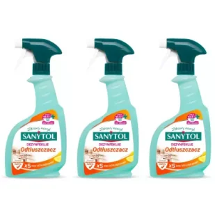 Spray do kuchni o zapachu cytrusów czyści odtłuszcza i dezynfekuje Zestaw 3 x 500 mlSpray dedykowany do kuchni, czyści i dezynfekuje bez chloru. Silnie odtłuszcza, łatwo i skutecznie czyści. Sanytol gwarantuje dezynfekcję usuwając bakterie, wirusy i pleśń oraz dba i nadaje blask wszelkim powierzchniom.