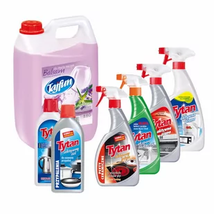 Mega zestaw środków do mycia kuchni marki Tytan W skład zestawu wchodzą: 1 x płyn do mycia kuchni Tytan ekspert w kuchni 500g spray 1 x żel do usuwania przypaleń Tytan 500g 1 x odkamieniacz Tytan 500g 1 x płyn do czyszczenia płyt ceramicznych Tytan 500g spray 1 x płyn do mycia piekarników Tytan 500g spray 1 x płyn do mycia lodówek i mikrofalówek Tytan 500g spray 1 x balsam do mycia naczyń lawenda z aloesem Tajfun 5kg