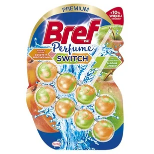 Bref Premium Perfume Switch z przełomową technologią Aqua Aktiv, która zmienia zapach kostek przy spłukiwaniu. Pierwszy - Słodka Brzoskwinia - uwalnia się, gdy kostka jest sucha dla poczucia świeżości już w momencie wejścia do łazienki, a drugi - Czerwone Jabłko - aktywuje się przy każdym spłukiwaniu. Dla utrzymania przyjemnego zapachu i świeżości toalety na dłużej.
