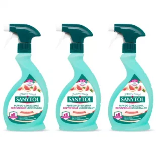 Spray uniwersalny o zapachu grejpfruta Zestaw 3 x 500 mlUniwersalny spray czyszczący i dezynfekujący do wszystkich powierzchni. Ekspert w czyszczeniu i dezynfekcji bez chloru. Preparat o wielu zastosowaniach, do wszystkich rodzajów powierzchni. Testowany dermatologicznie. Pozostawia przyjemny zapach grejpfruta.
