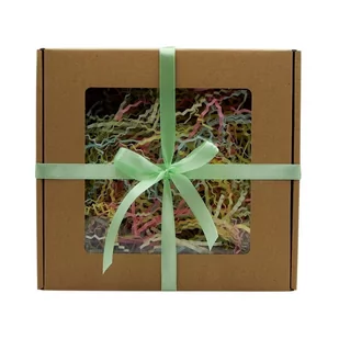 - pudełko fasonowe 20x20x10 - wypełniacz zygzakowy w kolorze mix pastelowy - 2m wstążki w kolorze jasnozielonym