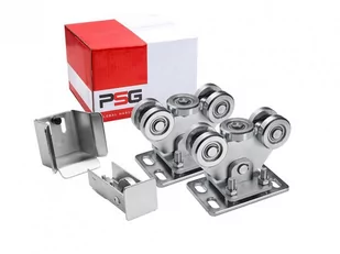 Pakiet wózków jezdnych 60. 003. 70 do bram przesuwnych samonośnych z szyną 70x70x5 mm, wraz z akcesoriami do montażu bramy. Wózek jezdny 60. 003. 70 (dwie sztuki) z 5 rolkami wykonanymi z metalu (w tym z jedną rolką poziomą). Wózek jest wahliwy i dopasowuje się do bramy przesuwnej (jest połączony z podstawą za pomocą trzpienia).