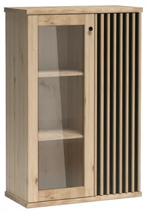 Witryna niska kredens do jadali CALI C3 Witryna ze szklanym frontem to eleganckie rozwiązanie do jadalni i salonu. Można w niej przechowywać porcelanę lub wykorzystać jako barek na ulubione napoje lub słodkości. Witryna nie jest wysoka, ale dzięki zastosowaniu szafy po prawej stronie z półkami pomieści wiele przedmiotów. Dodanie koloru czarnego do mebli tworzy ciekawe zestawienie z lamelami. ✔WYMIARY: