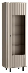 Przeszklony front z pionowymi frezowaniami w górnej i dolnej części tworzy intrygujące połączenie światła, formy i faktury. Szklane półki wewnątrz doskonale nadają się do wyeksponowania zastawy, książek lub ozdób, a opcjonalne podświetlenie LED podkreśla ich wyjątkowy charakter wieczorami. Dolna część witryny pozwala ukryć mniej reprezentacyjne przedmioty, zachowując wizualną równowagę i porządek. Smukła forma sprawia, że mebel idealnie sprawdzi się nawet w niewielkich przestrzeniach. Subtelna ekspozycja w eleganckiej formie Przeszklone drzwi z częściowym frezowaniem – łączą nowoczesną estetykę z dekoracyjnym rytmem kolekcji.