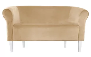 Miękka sofa wypoczynkowa wykonana z tkaniny typu Velvet, wyposażona w drewniane nogi w kolorze białym.