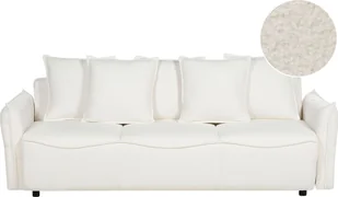 Tapicerowana sofa z funkcją spania. Umebluj swój salon tą stylową rozkładaną sofą, stanowiącą połączenie praktyczności i elegancji, zaprojektowaną z myślą o nowoczesnych wnętrzach. Tapicerowana trwałą tkaniną bouclé sofa z łatwością zmienia się w wygodne łóżko, idealne do położenia gości. Jej elegancki, minimalistyczny design uzupełnia współczesne przestrzenie, skrywając dodatkowe miejsce na kołdry i poduszki. Ten wszechstronny element, wzbogacony pluszowymi poduszkami, harmonizuje styl i wygodę, na nowo definiując komfort w każdej przestrzeni dziennej.