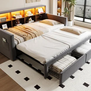 Zagłowie tej pikowanej sofy-łóżka zawiera drewniane półki oferujące dużo miejsca na książki, dekoracje i inne codzienne przedmioty, pomagając utrzymać pokój w czystości i porządku. Jest również wyposażone w oświetlenie LED oraz praktyczne gniazdka elektryczne (gniazdo/USB/Type-C) do ładowania urządzeń i tworzenia spersonalizowanej atmosfery.