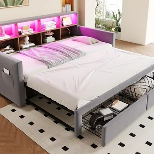 Zagłowie tej pikowanej sofy-łóżka zawiera drewniane półki oferujące dużo miejsca na książki, dekoracje i inne codzienne przedmioty, pomagając utrzymać pokój w czystości i porządku. Jest również wyposażone w oświetlenie LED oraz praktyczne gniazdka elektryczne (gniazdo/USB/Type-C) do ładowania urządzeń i tworzenia spersonalizowanej atmosfery.
